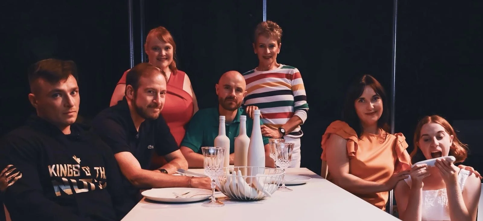 The script itself is built with a complex structure, with characters speaking over one another in a non-linear flow. Conversations come and go, emotions rise and shift, and the scenes move fluidly across time and many glasses of wine.